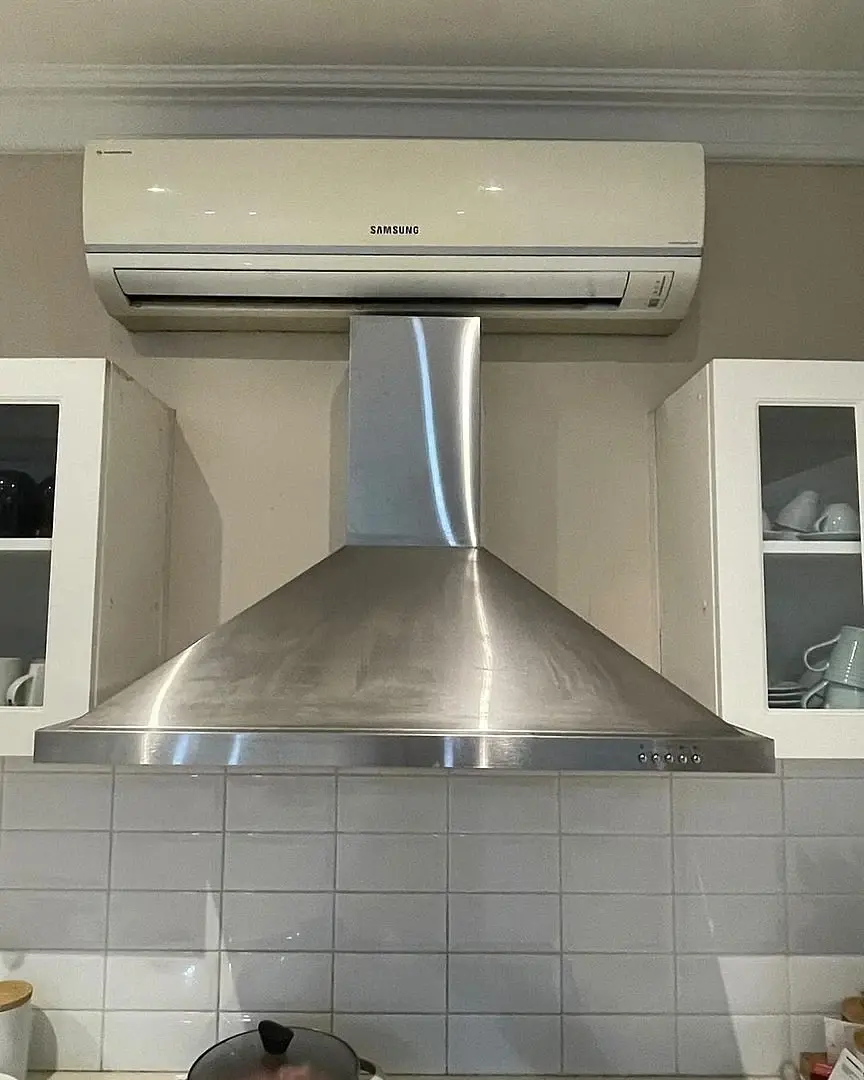 Если я правильно понимаю, то такое расположение сплита вполне допустимо. Дурацкое да, но допустимое, если нет места на кухне. Это вытяжка с фильтрами, ей не нужен выпуск сверху. На фото не видно, но там отверстия сбоку на трубе. Выпуск сверху закрыт. А кондиционер сейчас в выключенном состоянии. Когда включат - рамка воздуходува опустится вниз, не задевая трубу вытяжки. После фильтров - воздух теоретически чистый.