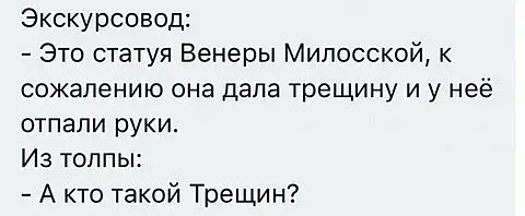 Родился мальчик, а у него вместо пупка гайка. Приходит он к бабкеповетухе и говорит: Слышь бабуль вот все дети как дети, а у меня гайкавместо пупка. Что делать?Это длинная история.Пойдешь за тридевять земель в тридевятое царство, будешь идти тридцатьтри года три дня и три месяца. Сносишь трое железных сопогов, сломаешьтрое железных посохов. Придешь туда, увидишь дуб на дубе будет ларец вларце будет заяц в зайце будет утка в утке будет яйцо и в яйце найдешьто, что тебе надо.Ну и пошел мальчик за тридевять земель в тридевятое царство, шелтридцать три года три дня и три месяца. Сносил трое железных сапогов,сломал трое железных посохов. Пришел туда, дуб завалил, ларец сломалзайца убил, утку убил яйцо ломает а там гаичный ключ внутри.Он гайку на пупке откручивает, у него жопа отваливается.
