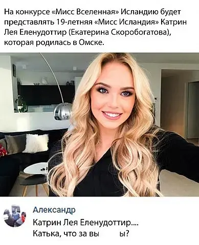 Чо та совсем устаревшая информация. Вот что раскопал про нее: As Miss Universe Iceland 2018, Katrín represented Iceland at Miss Universe 2018 in Bangkok.