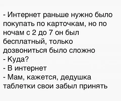 Зато можно было бесплатно хоть сутки сидеть, пока не ввели поминутную тарификацию домашних телефонов. Но вечные скандалы с соседом, с которым был спарен телефон помню хорошо. Я часами сидел в инете, соседка часами висела на телефоне, болтала с подругами.