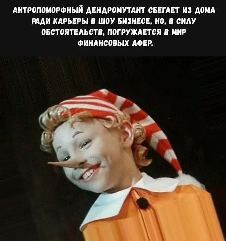 «Это описание похоже на Буратино из "Золотого ключика" Алексея Толстого. Буратино — деревянный мальчик (дендромутант в твоей формулировке), который сбегает из дома (как это делает персонаж в твоем описании) и попадает в разные авантюры. Хотя в классическом сюжете он не занимается финансовыми аферами, твоя версия звучит как забавная интерпретация его стремлений и попадания в сложные ситуации.»