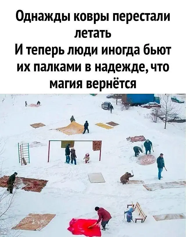 И когда бывало настолько холодно, что снег не таял, весь двор выходил чистить ковры, выглядело это примерно так, потому, что надо было успеть до потепления, т.е. пару часов)