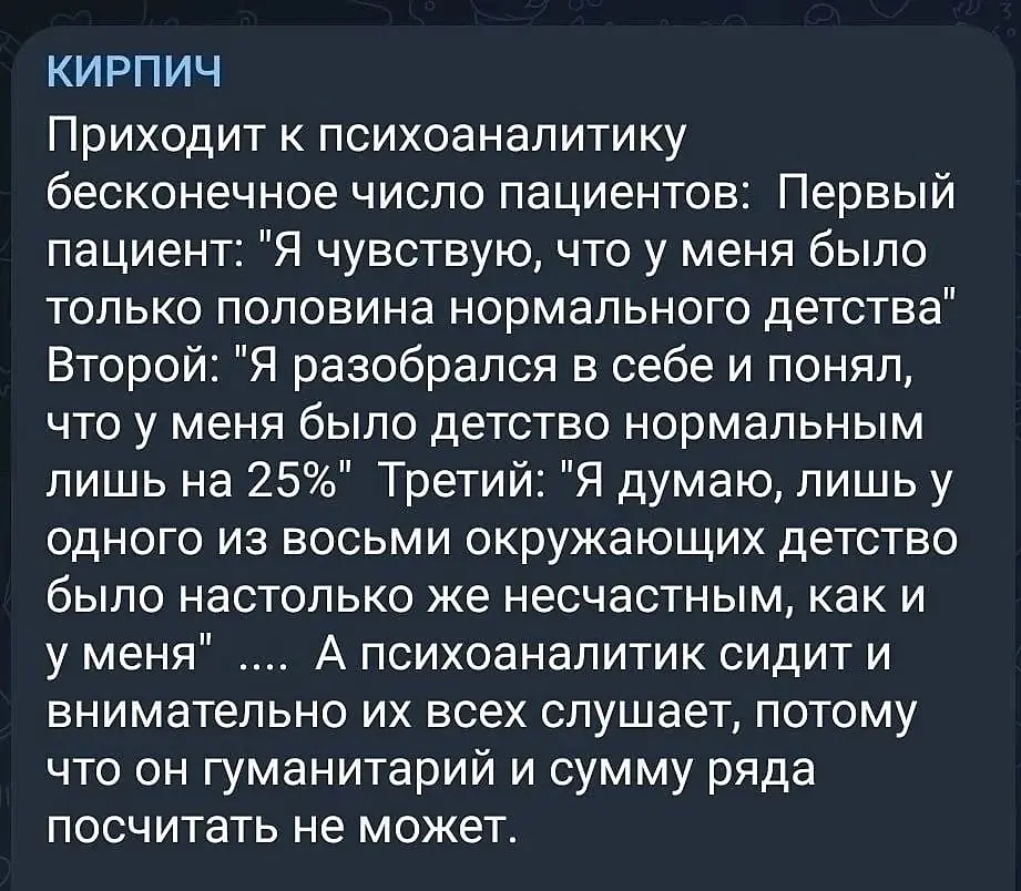 А разве у психологов есть другие причины? У тех у кого мог интересовался за посещение, в основном слово в слово как Вы и сказали. Либо родители, либо в школе/дворе гнобили и поэтому им сейчас спустя десятки лет аукается. Вот жду когда детям знакомых стукнет 20+ лет и они начнут ходить по психологам, которые им расскажут что их родители не так к ним относились и поэтому у них психологическая травма.