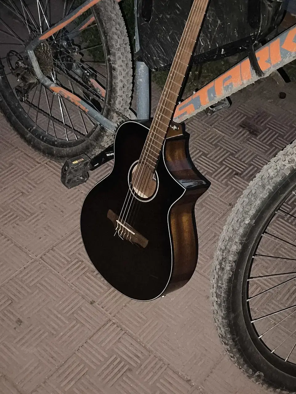 С гитарой что-то странное. Выглядит как акустика, вид какой-то неклассический: гриф заужается, точки есть на ладах, пятка в районе 15 лада а не 12 и т.п. А струны, судя по всему, нейлон. Странно это. Подозрительно.