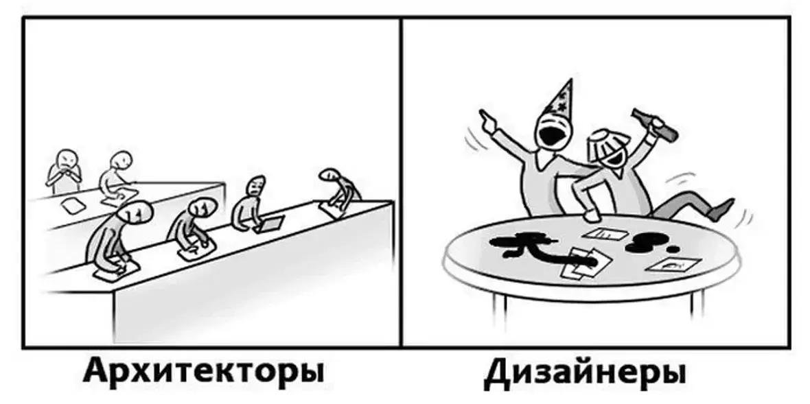 А я уверен, что архитекторы на правой картинке, а на левой - конструктора в афуе от того, что им наистерили архитекторы для просчета. Задний слева конструктор уже явно что-то задумал.