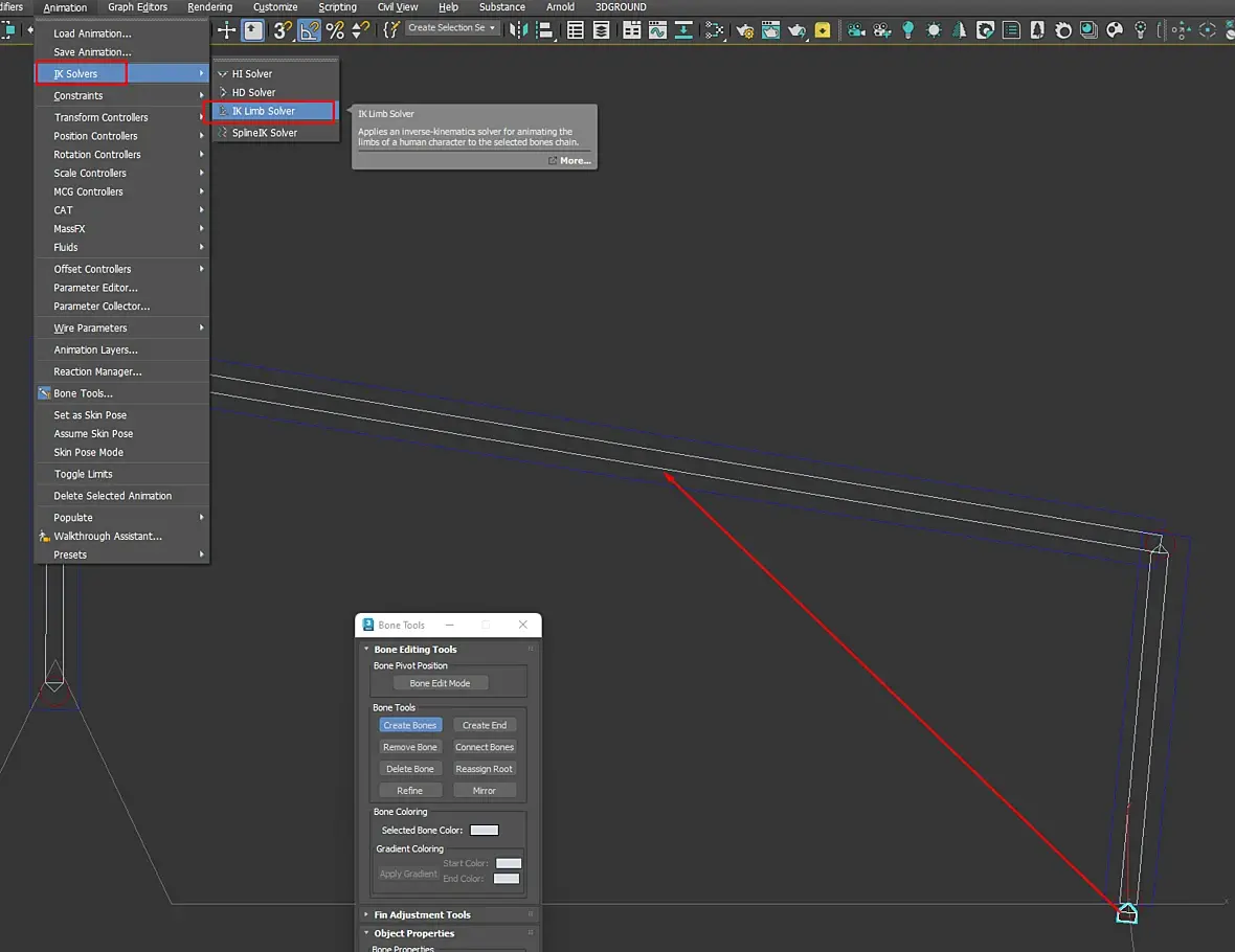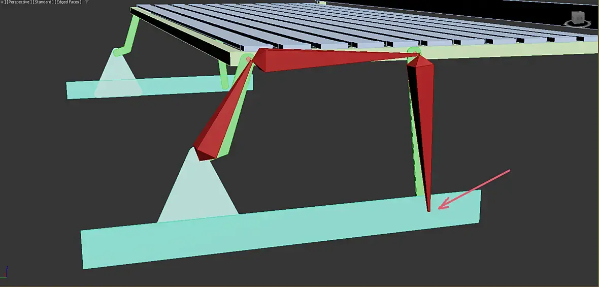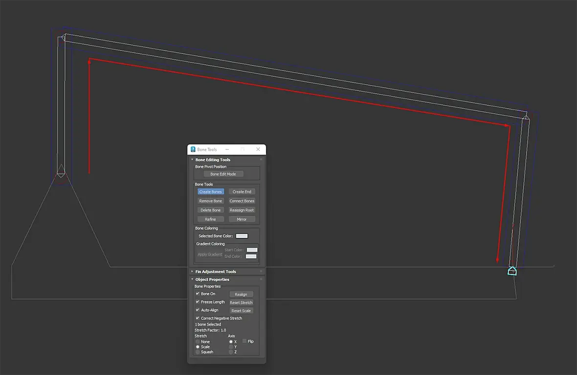 Сделай систему костей через стандартное окно работы с костями, внутри своей геометрии. в целом можешь и где то рядом, но это потребует работы с отступами опорных точек костей. проще сделать пивоты костей - пивотами шарниров сустава. Направление у меня слева направо, но это повлияет только на приоритетную "коленку"