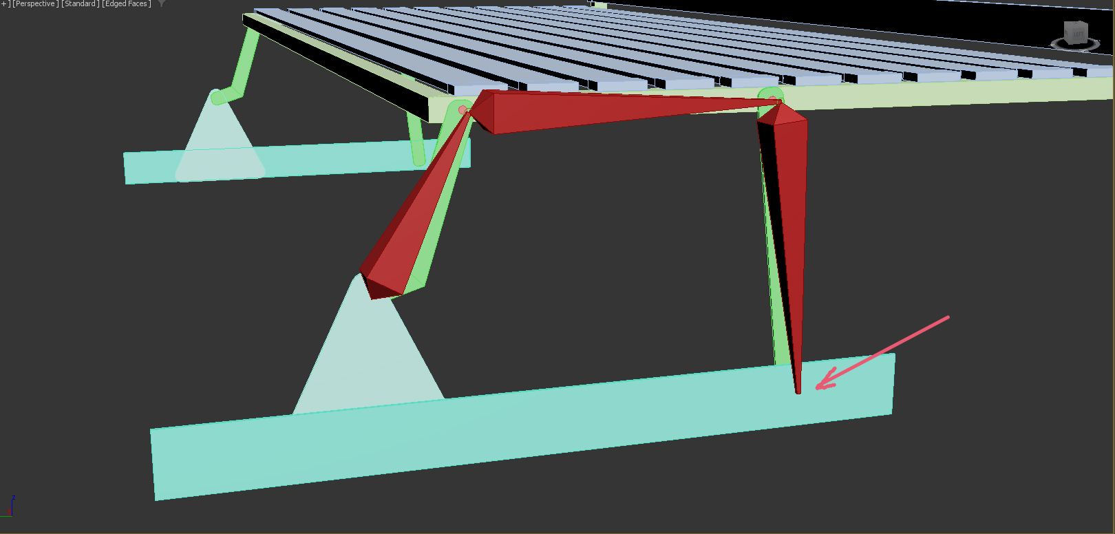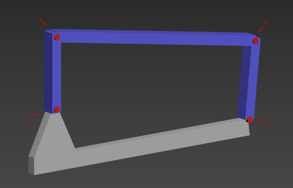 Сделай систему костей через стандартное окно работы с костями, внутри своей геометрии. в целом можешь и где то рядом, но это потребует работы с отступами опорных точек костей. проще сделать пивоты костей - пивотами шарниров сустава. Направление у меня слева направо, но это повлияет только на приоритетную "коленку"