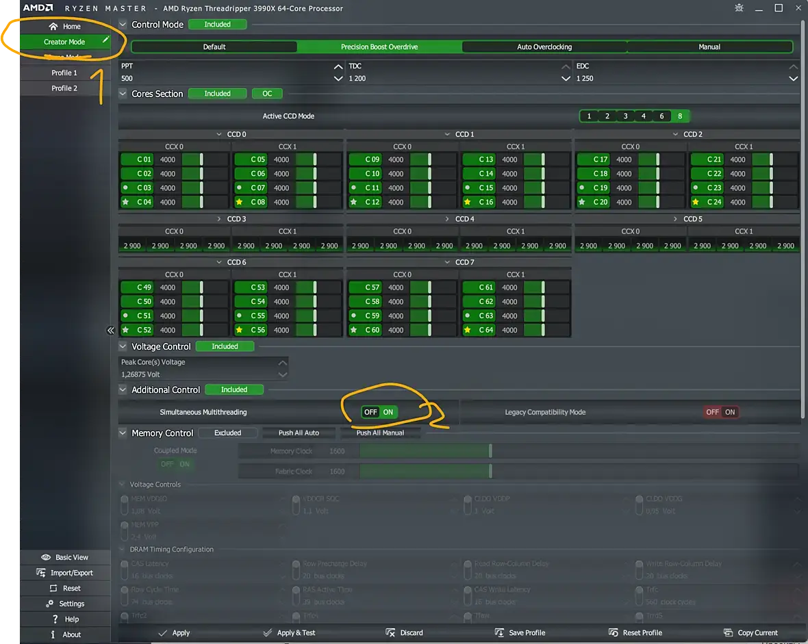 Привет. Собрал сборку 3990x + Asrock Taichi(биос 1.70, последний не бетта). И разочаровался тормозами во время работы, приимущественно по время интерактивного рендера короны (сильные задержки при перключении во вьюпорт/матедитор, тормоза при кручении ползунков. сильно тормозит микрофон (меня слышат с прерываниями)... и т.п. Еще не получается в диспетчере задать сходство ядер для макса (другому софту задается). Работается сильно хуже чем на 7950x.