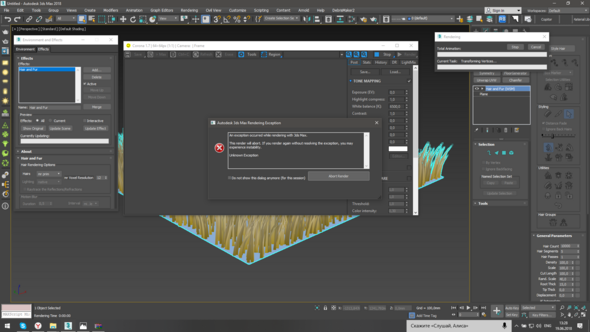 | Всем привет, возникла такая проблема. Накидываю на плейн hair fur и при запуске рендера выдает такую ошибку. Комп i7- 7700HQ Ram 24GB, GTX1050Ti