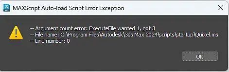 pet046, косяк не у квикселов, а в файле скрипта – когда он создаётся виндовым редактором, в него попадают невидимые символы разметки, они и наламывают всю малину. если есть другая версия макса – достаточно перетащить этот quixel.ms из неё в 24. вот с файлом из 23