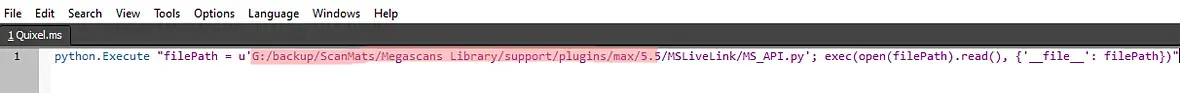 6. Сохранить скрипт с названием Quixel.ms, закрыть 3дмакс