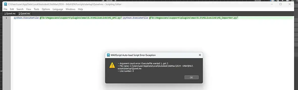 После прожима Evaluete All вылетала ошибка MSCoronaSetup.py и MS_Importer.py и нифига не работало. Начал пробовать через scripts/startup Quixel.ms грузить (то есть как бы логикой я понимаю что это просто указание 3DsMax-у что бы он запускал MS_API.py), но в этом у меня и оказалась проблема. Я через Quixel.ms тупо ловил постоянно ошибки синтакса в первой же строке. А иногда половину пути он указывал с \ а другую с /