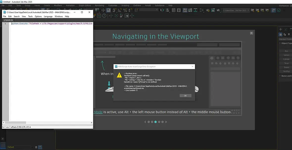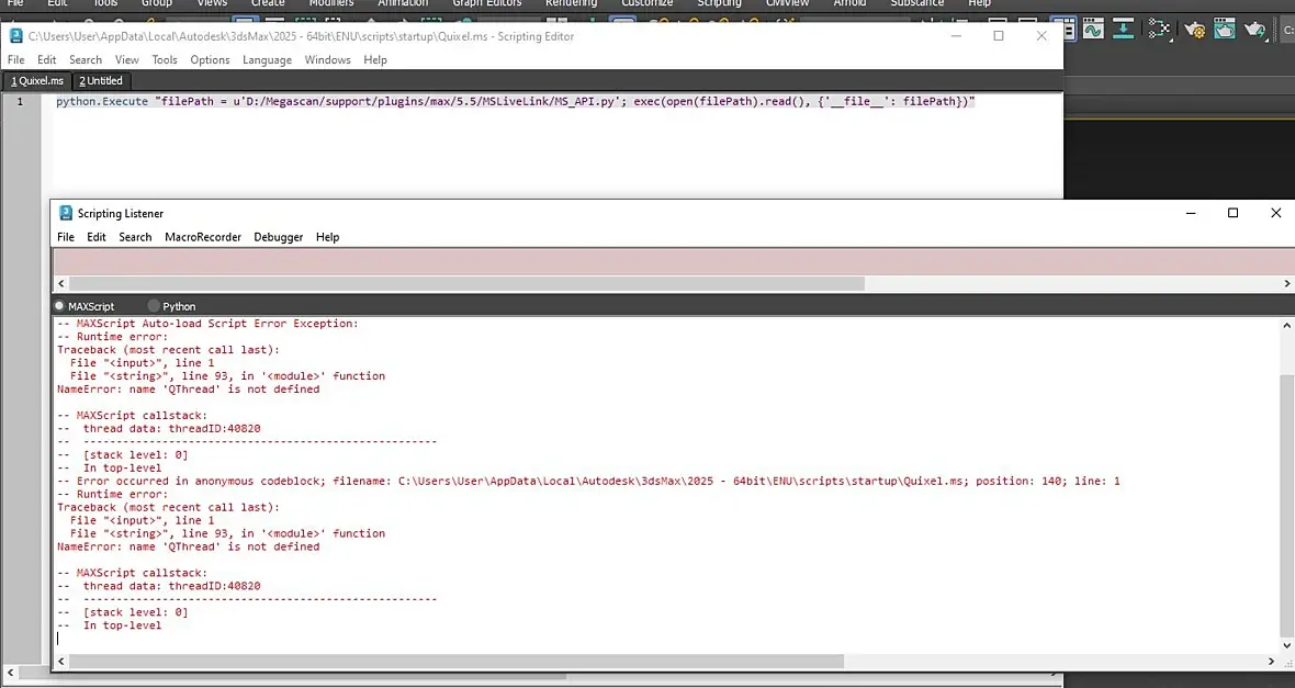 После прожима Evaluete All вылетала ошибка MSCoronaSetup.py и MS_Importer.py и нифига не работало. Начал пробовать через scripts/startup Quixel.ms грузить (то есть как бы логикой я понимаю что это просто указание 3DsMax-у что бы он запускал MS_API.py), но в этом у меня и оказалась проблема. Я через Quixel.ms тупо ловил постоянно ошибки синтакса в первой же строке. А иногда половину пути он указывал с \ а другую с /