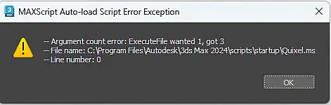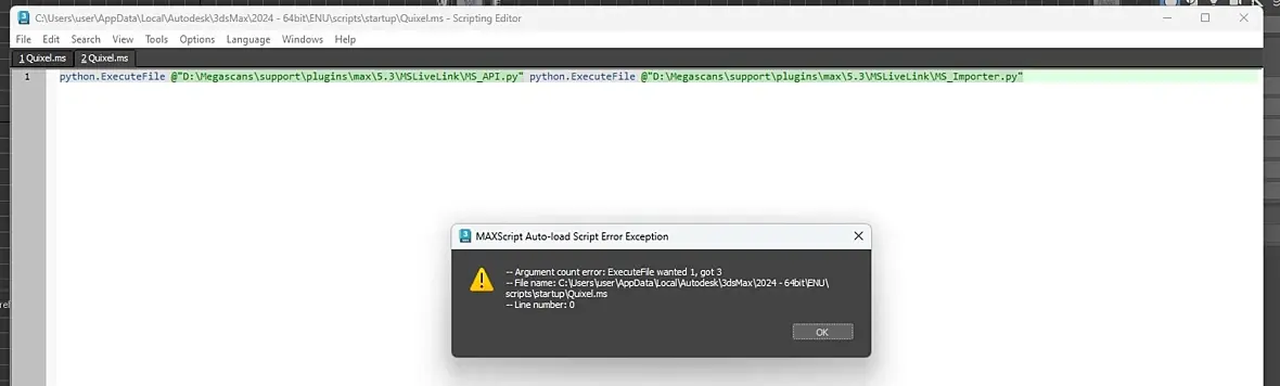 pet046, косяк не у квикселов, а в файле скрипта – когда он создаётся виндовым редактором, в него попадают невидимые символы разметки, они и наламывают всю малину. если есть другая версия макса – достаточно перетащить этот quixel.ms из неё в 24. вот с файлом из 23