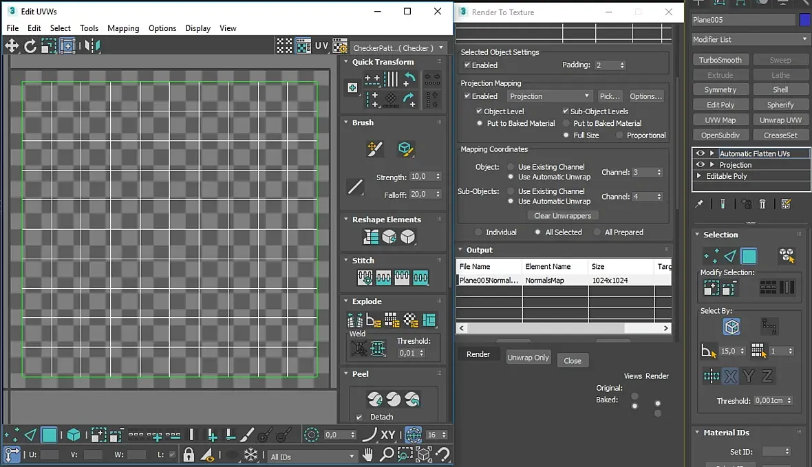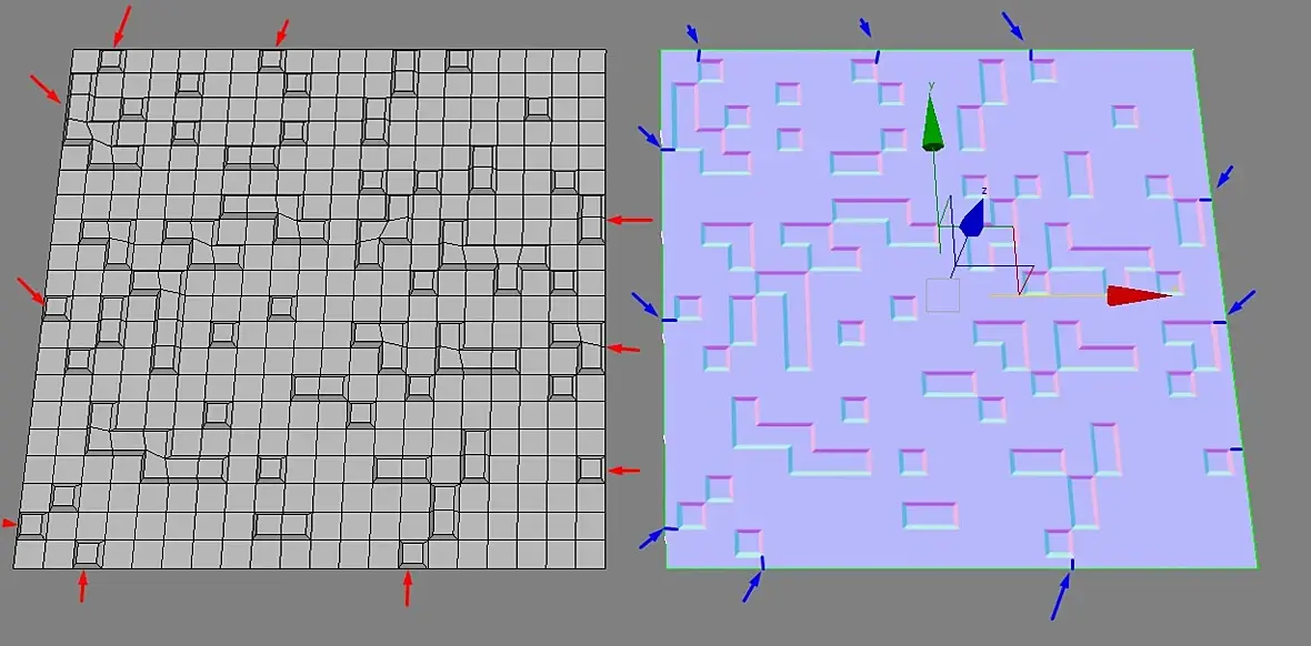 решил запечь простенькую текстурку. На модели слева (я показал красными стрелками) видно что выпуклости находятся у самого края плоскости, на плоскость справа (она чисто плоская, в один полигон) я накинул запеченную текстуру, но почему-то крайние выпуклости идут с отступом от края плоскости (показал синими полосками) . Почему так происходит и как убрать этот отступ ? кто шарит, подскажите плиз