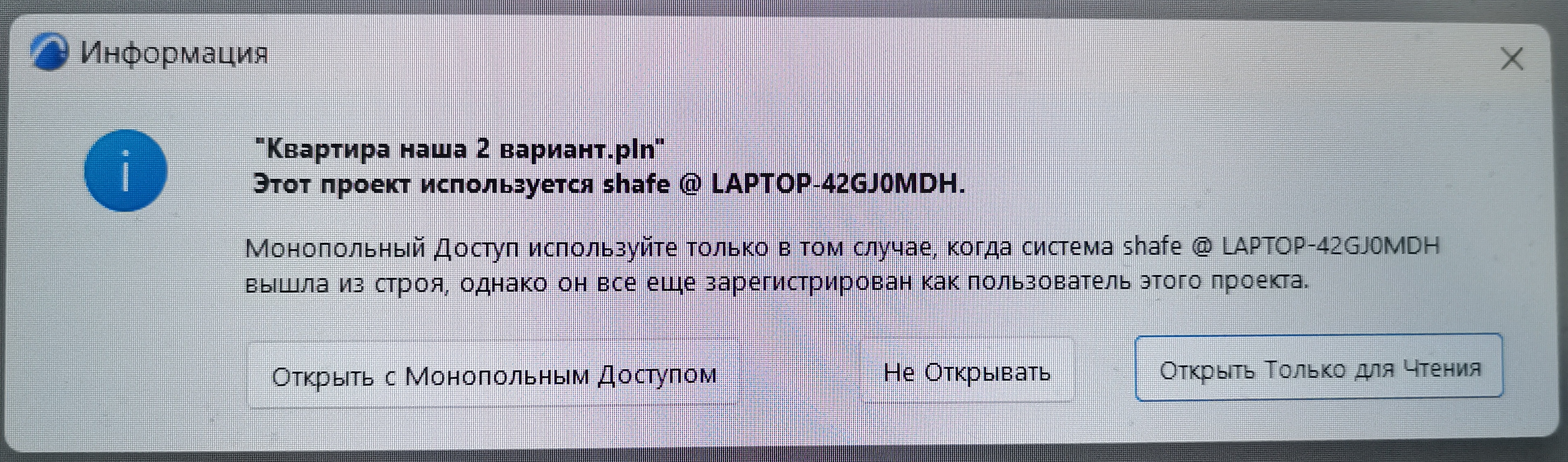 Пишет: "Монопольный Доступ используйте только в том случае, когда система вышла из строя, однако он все еще зарегистрирован как пользователь этого проекта."