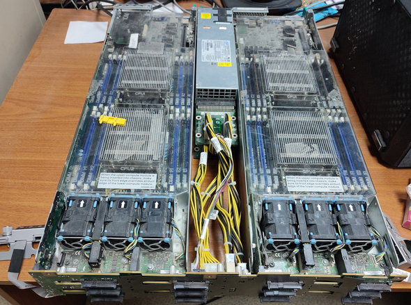 | Серверная 4х-нодовая платформа intel H2312XXKR2 без корпуса, процессоров и памяти. (8-процессорный сервер под E5-26XX v3/v4) Состав: 2x ноды S2600TP по 2 сокета LGA2011v3 (процессоры intel E5-26XX v3/v4), 16 слотов ОЗУ DDR4reg, 2 PCIe 16(1 проприентарный) 2x ноды S2600KP по 2 сокета LGA2011v3 (процессоры intel E5-26XX v3/v4), 8 слотов ОЗУ DDR4reg, 2 PCIe 16(1 проприентарный) БП 2х1600W platinum80 фронтальная плата на 12 дисков (SAS12G/SATA6G) 2x блока с кнопками и индикаторами Руки так и не дошли собрать полностью (корпус,память и процы).