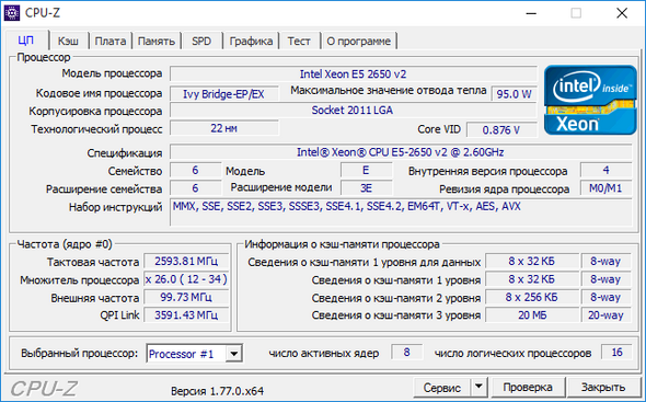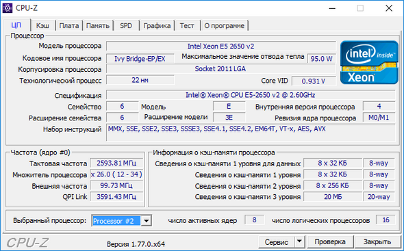 Процессоры: E5-2650v2 OEM (2шт). В однопотоке работает на частоте 3.4 ГГЦ, при загрузке на все ядра 3 ГГЦ, в сумме 16 ядер/32 потоков