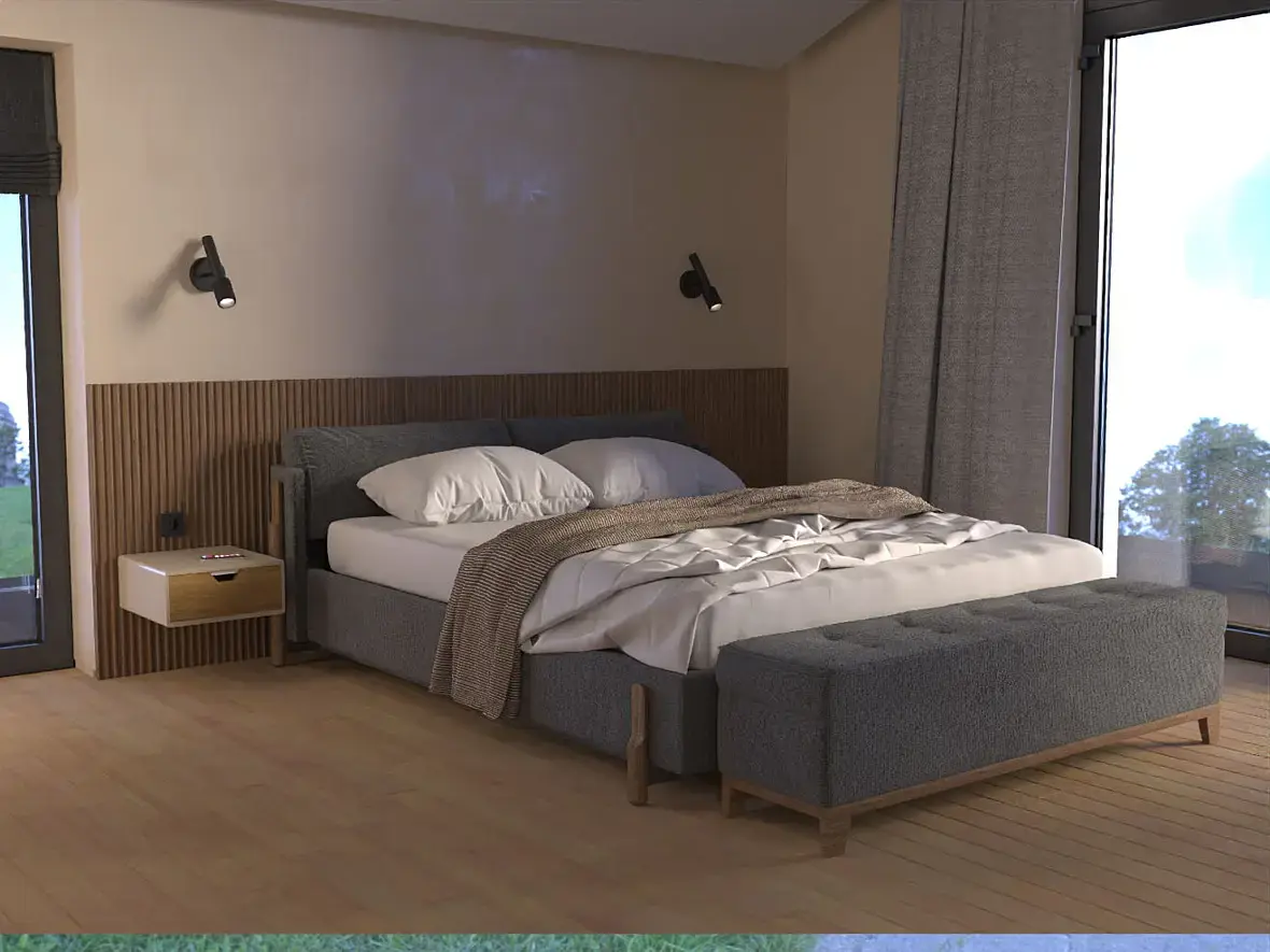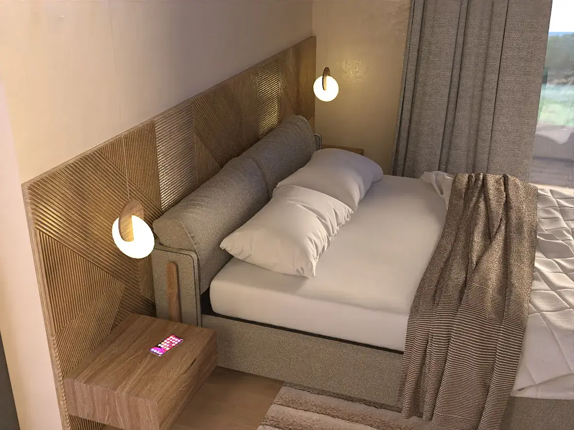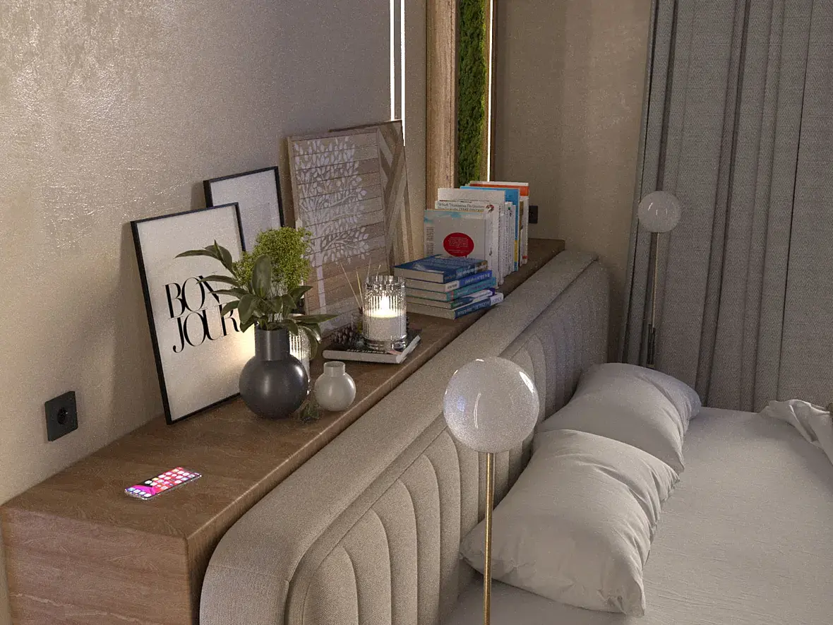 Этот вариант зашел частично, но заказчик решил, что нужно двигаться в сторону минимализма и сканди. И если убираем узголовье-полку - возвращаемся к прикроватным полкам: