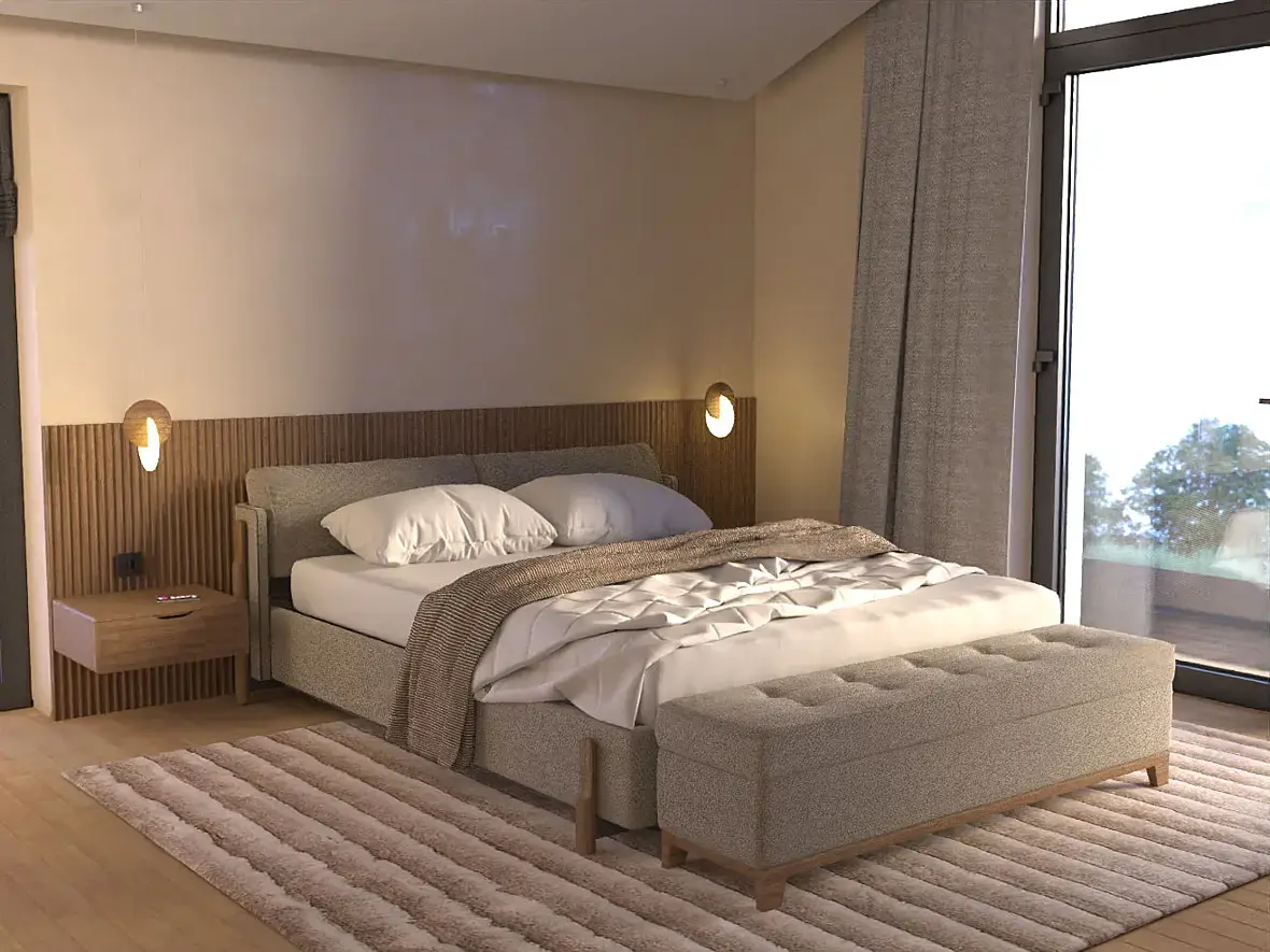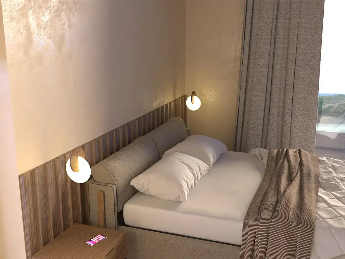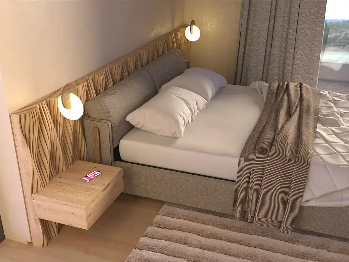 Этот вариант зашел частично, но заказчик решил, что нужно двигаться в сторону минимализма и сканди. И если убираем узголовье-полку - возвращаемся к прикроватным полкам: