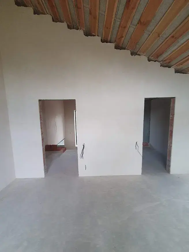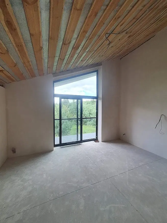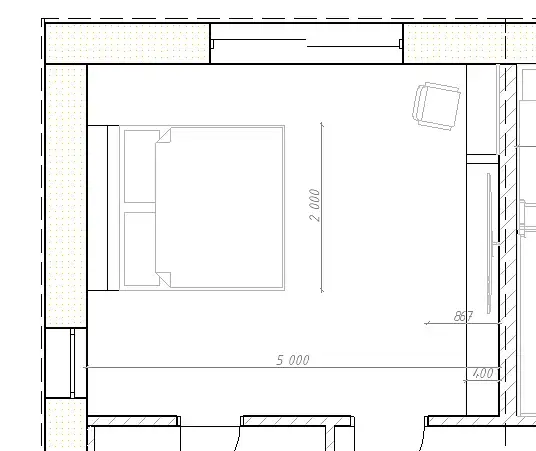 Итак, первая комната - спальня - именно над ней сейчас работаем. Есть фото комнаты и есть спроектированная планировка. Из начального ТЗ - потолок из вагонки, потайной свет, подвесной потолок, потайной плинтус, потайная дверь. По стилю и цвету пожеланий нет. По фото ниже видно две двери - одна вход в комнату, вторая - вход в с/у, по дороге в с/у - гардероб. Поэтому в комнате не будет шкафов. Также из пожеланий - большая кровать (2м шириной), а такой размер делает трудным местом для тумб (полки или пр.).