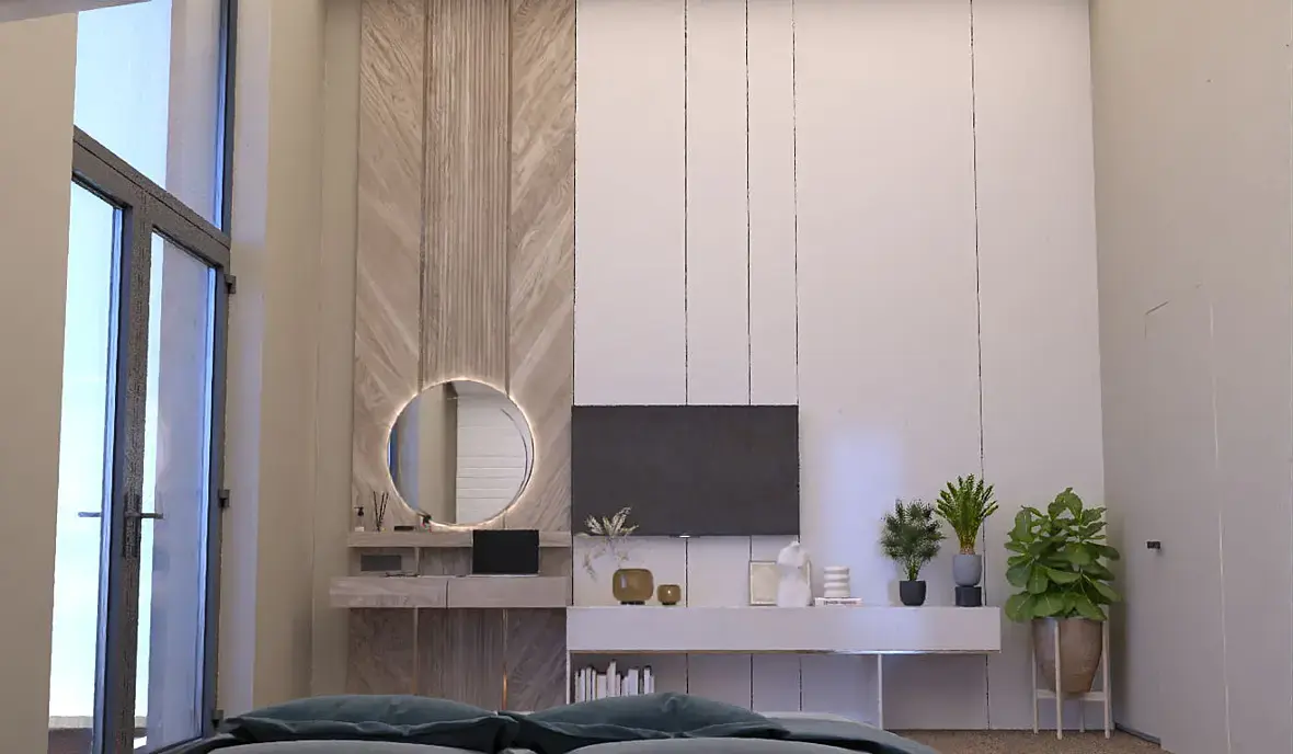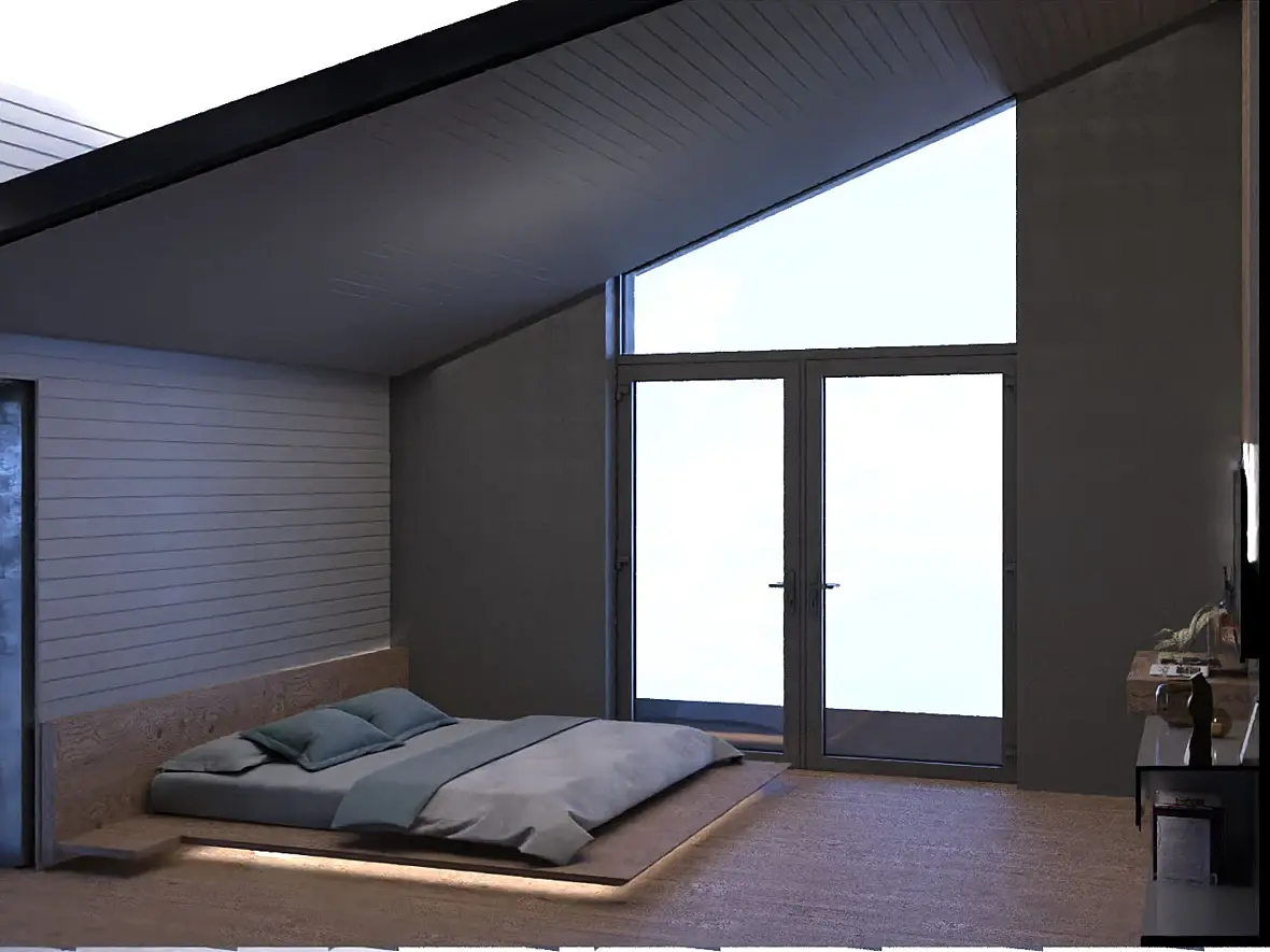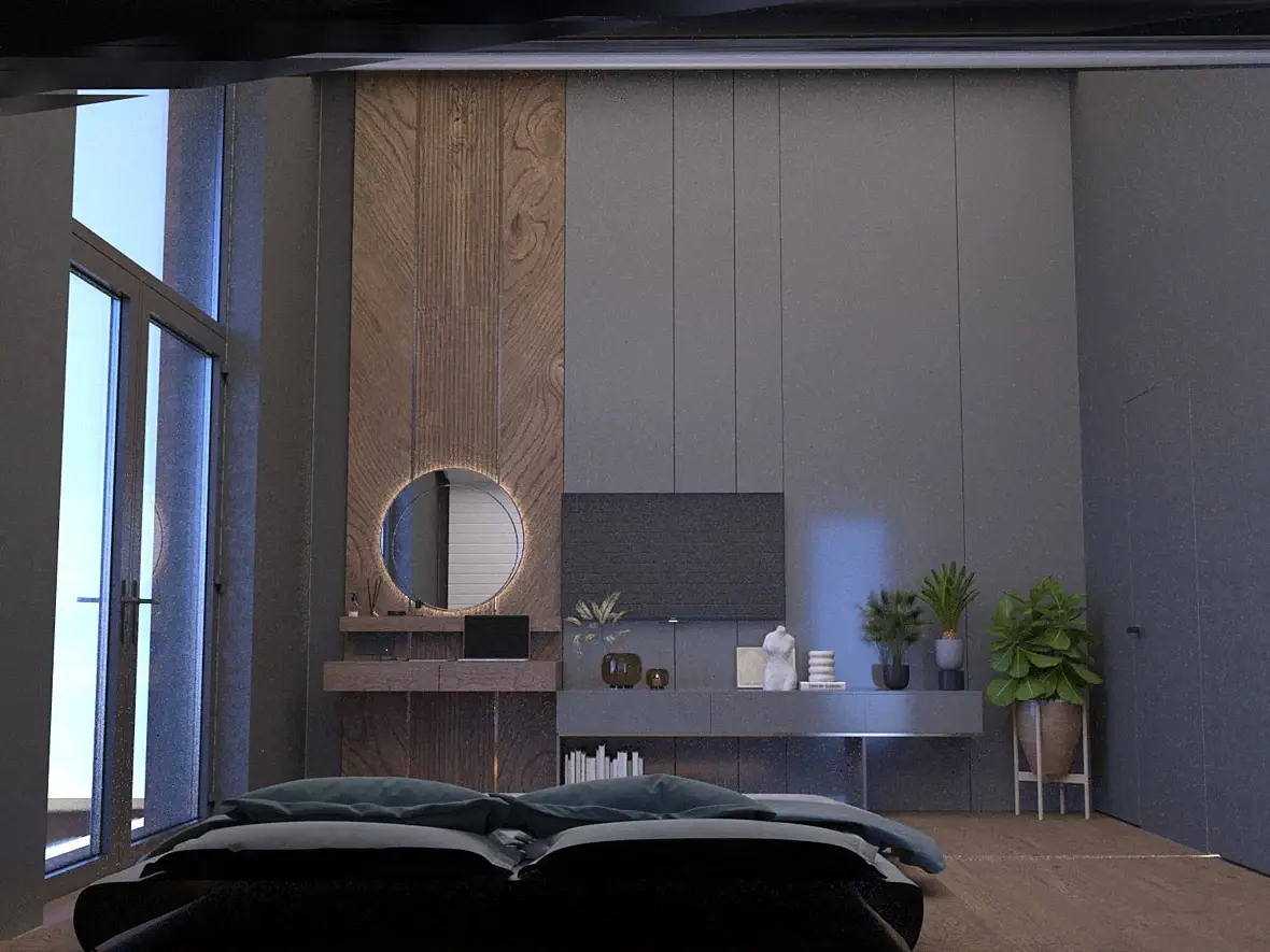 Зону ТВ утвердили практически сразу, только работа над оттенками. По кровати и стилю не подошло. Заказчик провел семейный совет (обсудили рендер с семьей), им было предложено сделать темную сплальню и вагонкой стену у кровати. К тому же, он увидел парящую кровать в каком-то пине: