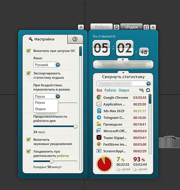 Отслеживает активную деятельность. Например, изначально в настройках стоит если не ошибаюсь - ПАУЗА через после 5 минут простоя...например, сижу моделирую что-то - таймер ведет учет времени в 3д максе..вдруг чаю-кофе захотелось - пошел на кухню - компьютер бездействует 5 минут - таймер уходит НА ПАУЗУ...если перенастроить чтобы переключалось не на паузу а в режим отдыха, то считать будет как время отдыха....там по разному можно настроить...можн очтобы через 1 минуту переключалось...чтобы более точная статистика была