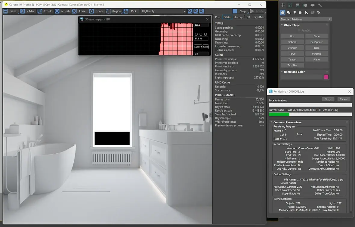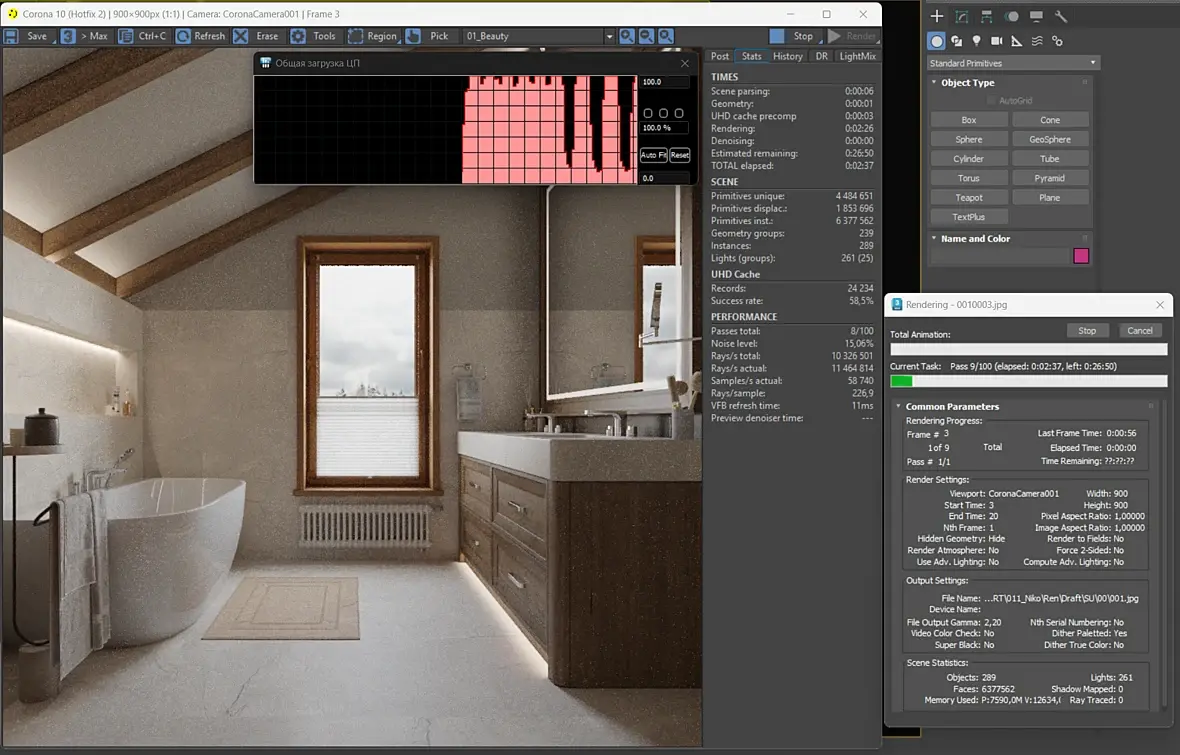 Шторы и окно я отдельно уже проверял, не в них дело. Я вообще удалил всё кроме стен, и зафигачил большой шар из стекла(чтобы нагрузить проц) в итоге просадки были. Забавно что Image Filter у меня и так не стоит High quality уже давно, я делаю на Parabolic уже несколько лет)