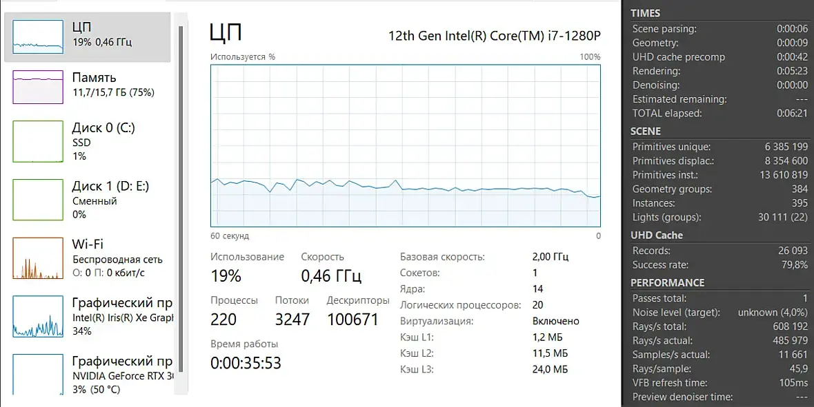 Коллеги, ситуация следующая. 1280p ноутбучный при запущенной короне не уходит в 100%, а остается на 20-25. Винда 11, корона 9-2, макс 24 Как я подозреваю, проблема может быть в самом ноутубке, потому что даже систему охлаждения на максимум он не запускает. В биосе включено все, что связано с быстродействием проца