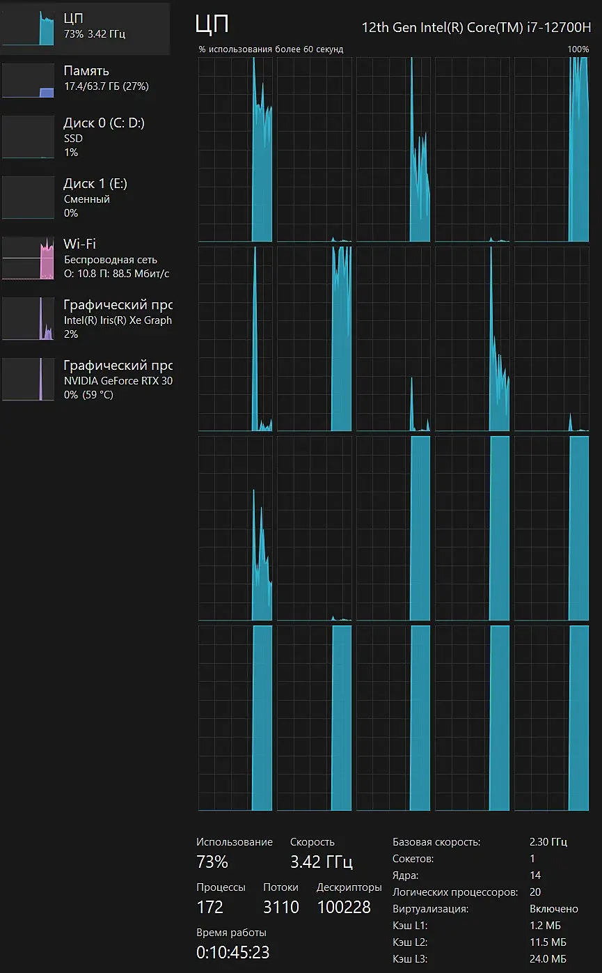 не уходит в 100%, а остается на 20-25. Винда 11, корона 9-2, макс 24