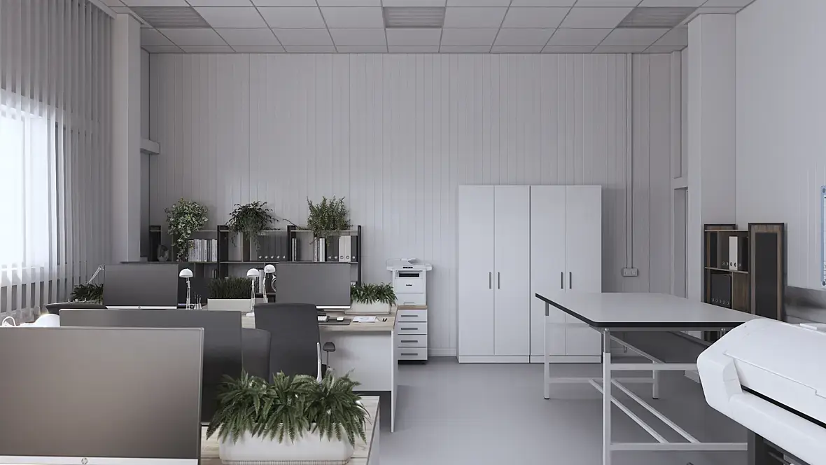 Кстати говоря, про темный потолок офиса: разве он не будет давить? Так как он и делается светлым, потому что прямой свет на него не попадает