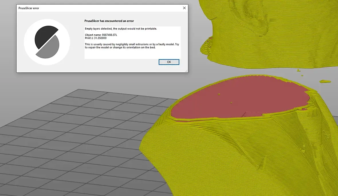 Здравствуйте! Столкнулся с проблемой пустых слоёв в модели: рендер проводится успешно и модель полноценно отображается при загрузке в слайсер или любой другой софт для работы с 3д, будь то Макс или Блендер.Срыв слоёв выглядит как на скрине