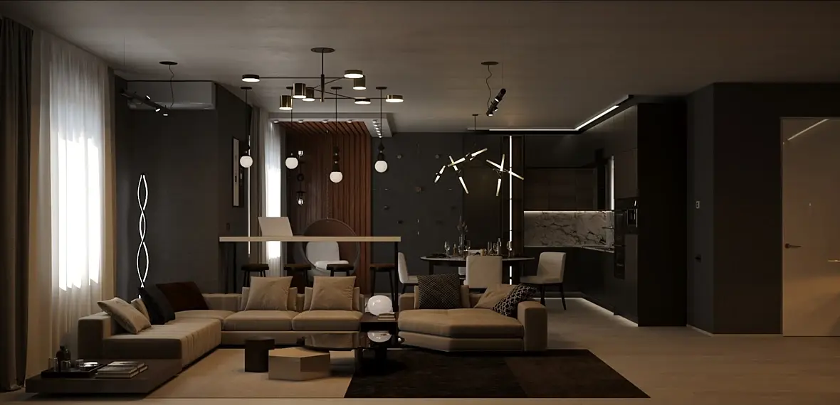 Четыре: со светильниками у Вас действительно ядрёный винегрет. Понимаю, что тут Вы попытались продумать множество сценариев освещения (что классно), но нужно запроектировать меньше декоративных светильников и больше базовых. Иначе они сильно диссонируют между собой, неприятно визуально пересекаются и загромождают пространство.