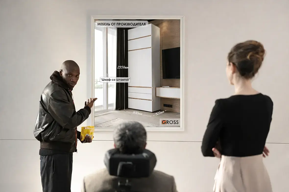 это же тоже рендер и тоже с ошибками функционала, ищите реальные примеры, ну или хотя бы посмотрите на рендеры икеи, на маркетплейсах не стоит смотреть рефы, там обычно платят копейки и соотвественно и качество такое же, но хотя бы ковер перед телевизором, но шкаф ни к месту, подсветка кривая, так дизайнер интерьера не будет делать