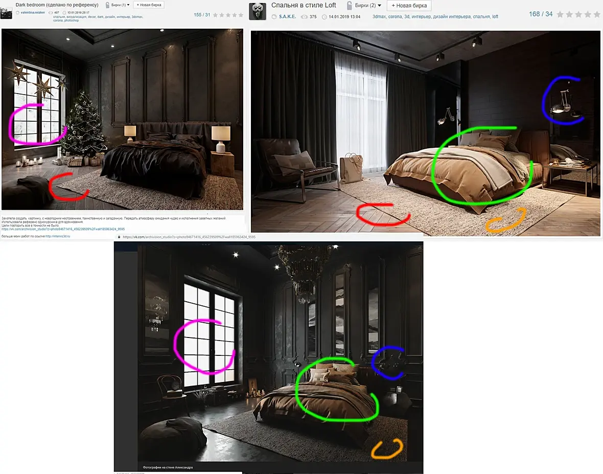 Один из мастеров сослался на реф, спасибо ему, но второй мастер выложил работу без ссылки, однако при сравнении я сделала вывод, что какие-то детали явно не случайны: например, один и тот же ковер, бежевое постельное, светильники над кроватью.