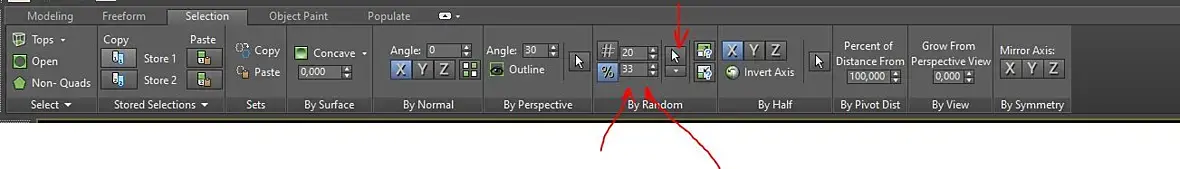 Но вот еще вариант "полуручной" так сказать. Если это геометрия плиток (едит поли), у вас старая корона, мультитекстур нету, и ничего подобного нету, вручную тыкать каждую не хотите, можно попробовать еще следущее)) Через селектор геометрии, только если он выберет какие-то отдельно стоящие полигоны, то просто нажать гроу пару раз, а клацать самим селектором можно до тех пор пока не устроит результат. Результат полюбом будет отличаться от модификатора. По идее сначала надо выбрать 66%, потом 33% и соотношение должно +- сохранится