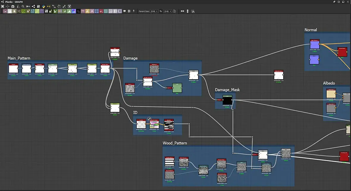 Да и создание библиотеки материалов в дизайнере, экономит кучу времени, один раз сделал к примеру продуманный, комплексный материал дерева и больше уже ничего не надо. Потом просто ползунками меняешь пару параметров и вот уже другая текстура, покрутил "сид" - изменил характер паттерна, еще покрутил другой параметр - состарил материал и т.д.