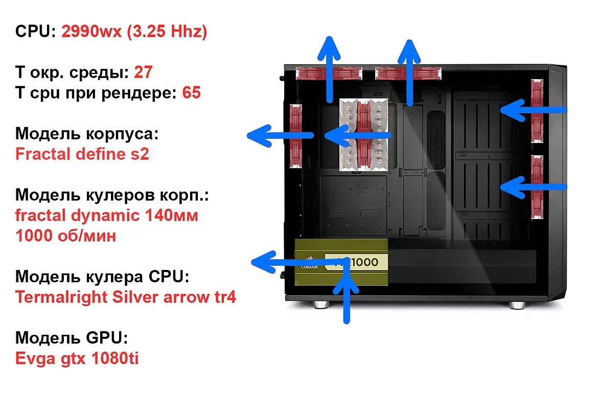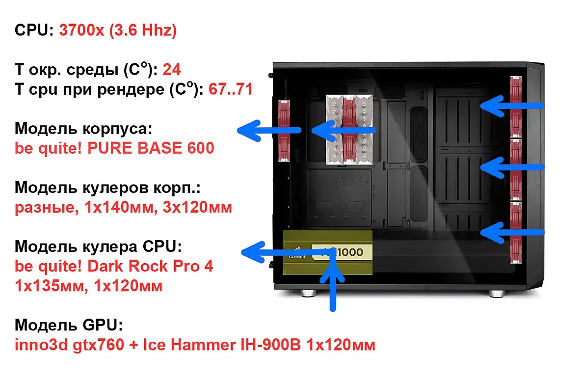 Всем привет! Решил собрать статистику по воздушному охлаждению, а именно по расположению кулеров. Для этого подготовил файл фотошоп, в котором вы сможете (ежели не влом))) расположить кулеры и стрелочки которые я разложил в нескольких слоях, там все понятно и удобно. Так же нужно будет перебить текст под себя, указав свои параметры. Думаю это будет полезной инфой для всех. Обратно можно кидать просто скриншот или ссылку. Видюху я не стал показывать на схеме, ее указываем слева. Оставил блок питания, так он отводит часть воздуха наружу.