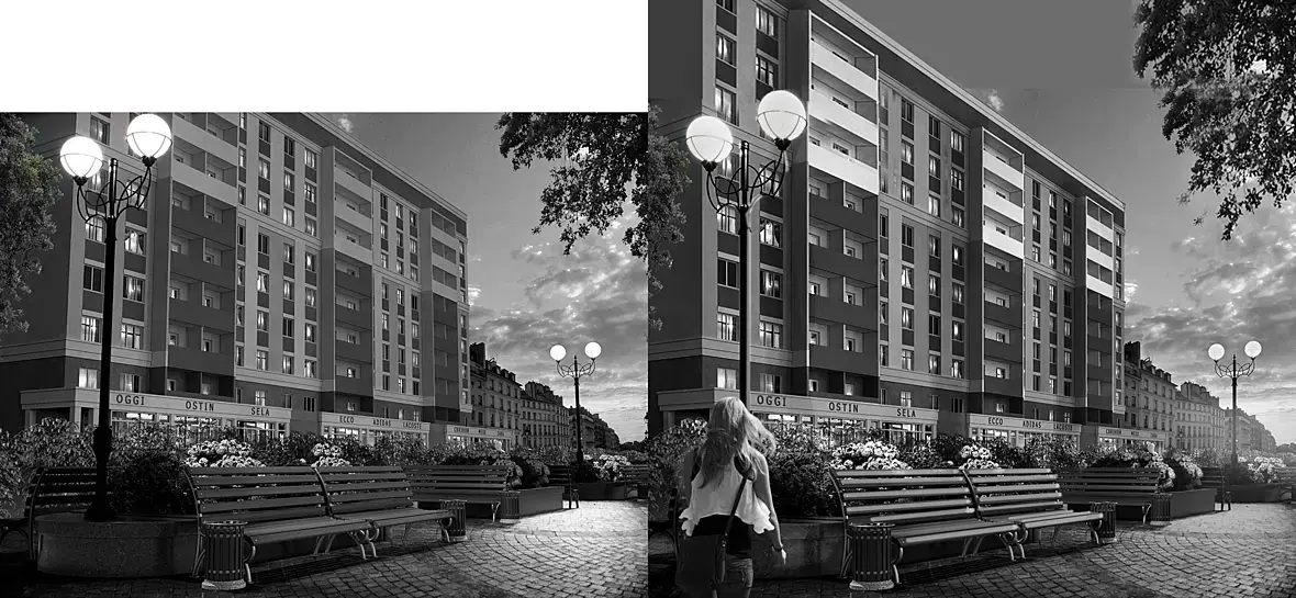 Добавлены якрие акценты на элементах дома, лавках, фонарном столбе, растительности. Добавлена воздушная перспектива, чтобы избавиться от контраста между небом и домами вдалеке. Прикрыта чернота слева на переднем плане. Дом по тону отбит от неба.