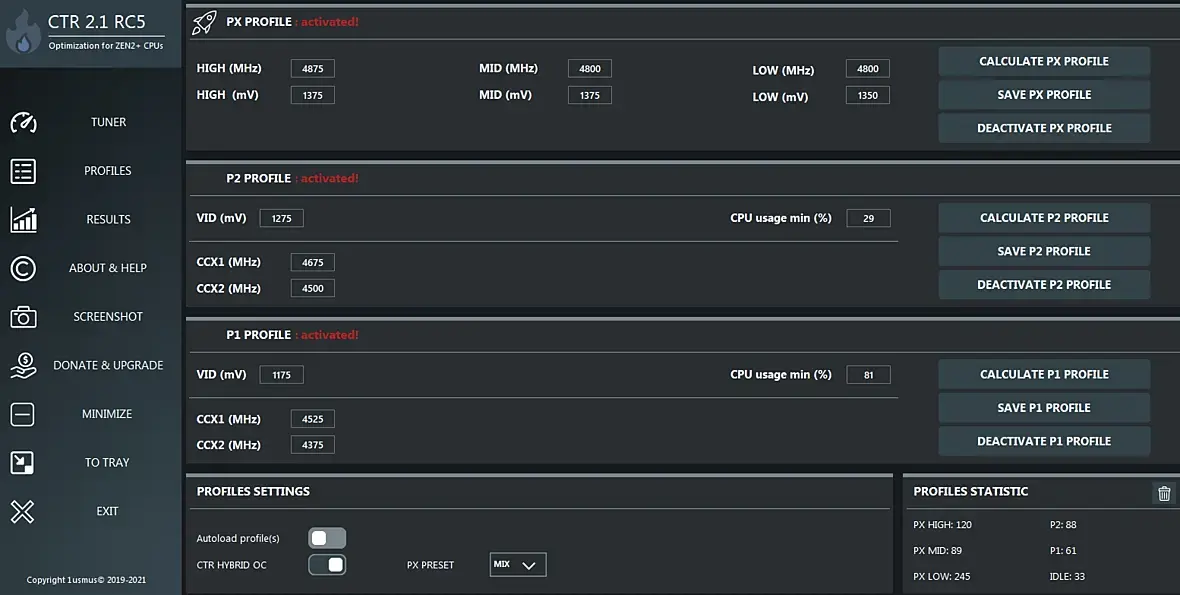 Однако, при всем этом, CTR включается спустя добрую минуту-две после запуска шиндошс и блокирует частоту на штатных 3700, пока не сделаешь выкл-вкл профиль. Адаптивный разгон на 3 профиля я не использовал, пока что только самый "холодный" P1. Против адаптивного ничего не имею, но не понимаю, что пошло не так и почему CTR требует "перевключения".