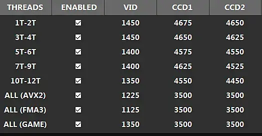 Проц 5950х использую гибридный профаил с настройкой P1 профиля 4475 х 4375 VID 1200 (по показанием матери выходит 1.13) Vdrop примерно 5-6% - температуры после часа рендера примерно 65-67 градусов. Остальные профиля дефолтные, в смысле управляются материнкой и логикой проца.