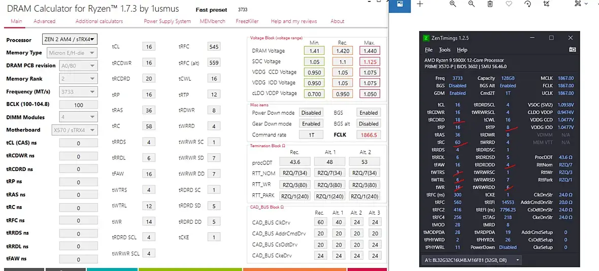 Хотя вот например работа Micron Rev.E двурангов 16гб плашек и двурангов 32гб плашек Micron Rev.B почти 1 в 1 сходится с калькулятором у меня.