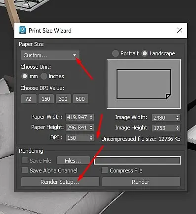 т.е. поставив DPI к примеру 300, можно взять те параметры, которые посчитает справа в image width и image height и их просто прописать в рендер сетап.