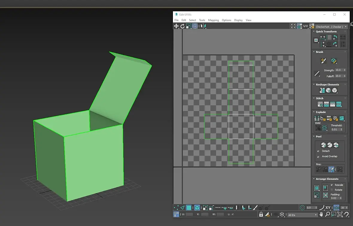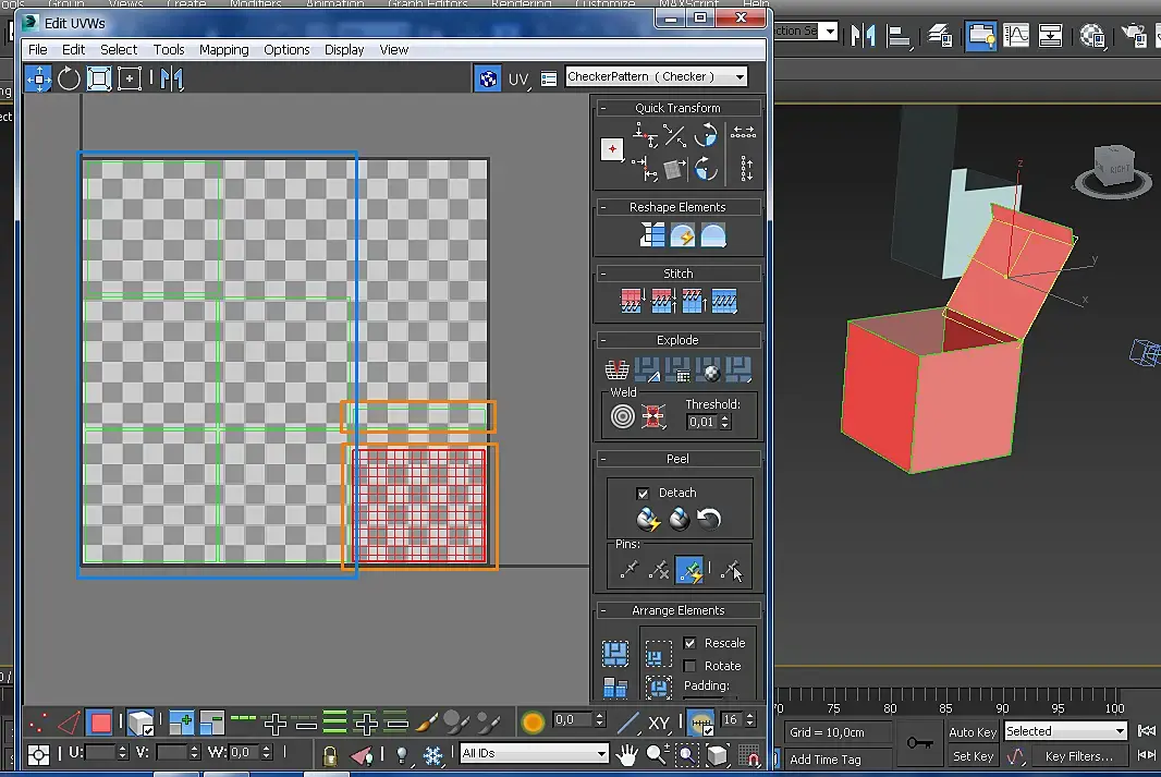 При помощи Box сделан куб. Из него были отсечены (Detach) отдельные элементы, а после соединены (Attach). Во время применения Unwrap UVW можно соединить в развертку только отдельные части фигуры (см. рисунок). Оранжевым выделены части, которые не соединяются ни с чем, синим - все, что можно соединить.