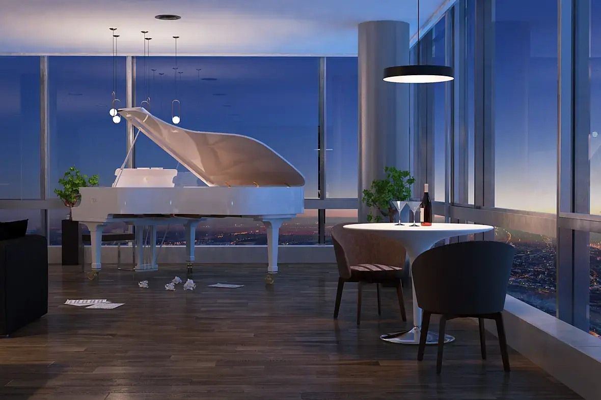 7) У вас проблемы с масштабом. Стол обычно 76-78 см, а рояль на 100 см. У вас тут рояль на 1.5 метра высотой. Сиденье стула должно 40-42 см заканчиваться, у вас на 30 примерно и т.д.