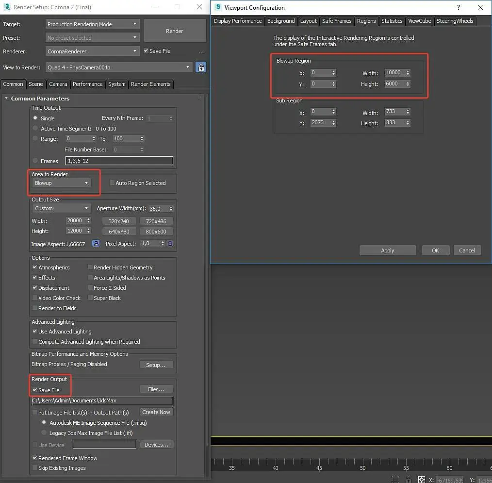 1. При помощи Blowup (Rendering > Render Setup во вкладке Common > Area to Render > Blowup) + Blowup Region во вкладке Viewport Configuration. Проблема этого способа в невозможности точного контроля рамки Blowup через Blowup Region в нижней и правой областях изображения при размере в Output Size более 20000 пикселей, т.к. высота рамки (width) не делается более 10000 пикселей... Может кто-то и знает, как фиксировать область рендера при перемещении строго по оси X или Y, поделитесь информацией.