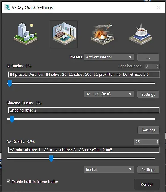 В качестве настроек рендеринга использовал V-Ray Quick Settings: