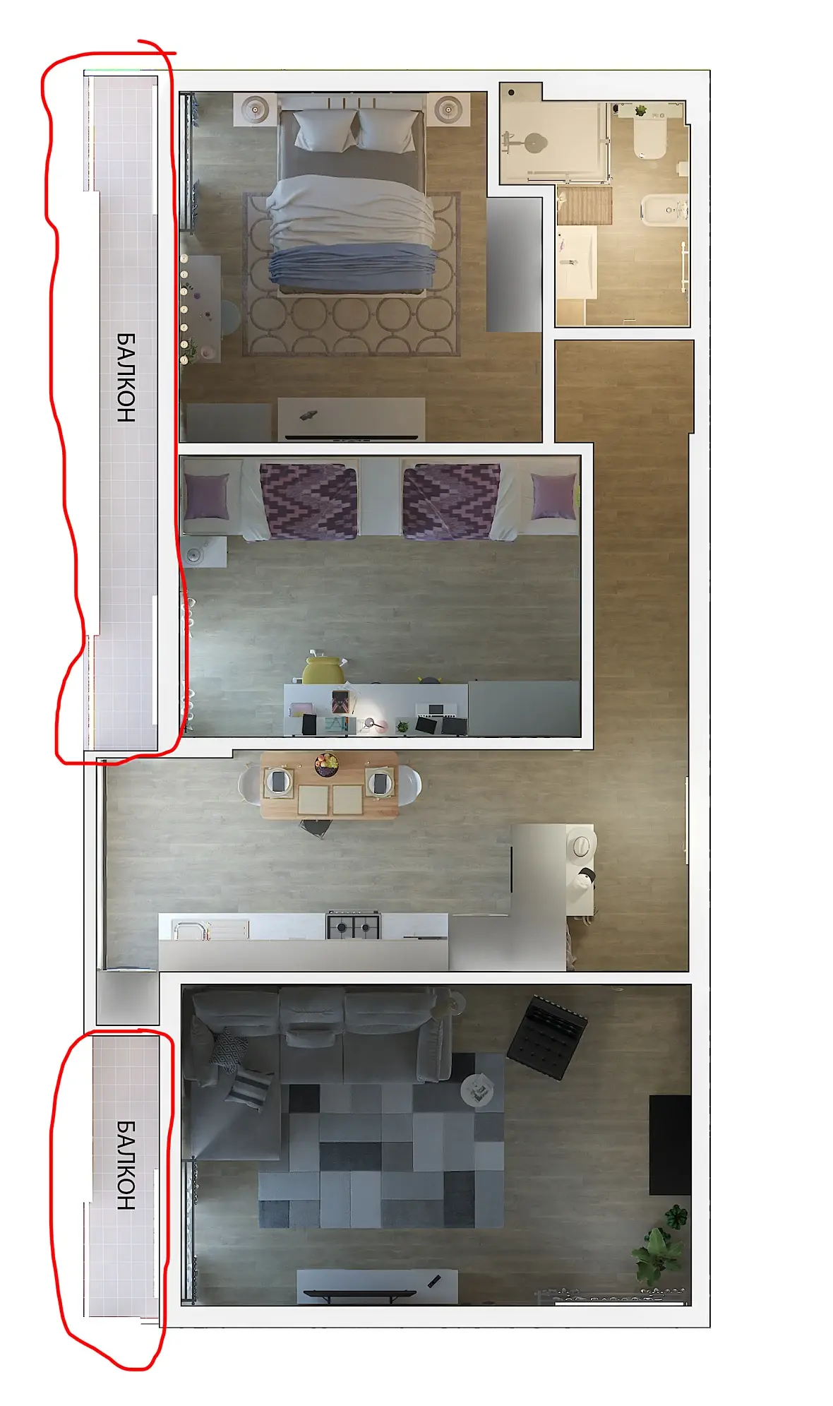 - над самой квартирой есть потолок, который исключен из рендеринга, и внутри все получается нормально. А вот балконы, т.е. все, что не под крышей, ужасно засвечено, и плохо рендерится - все замыленное.