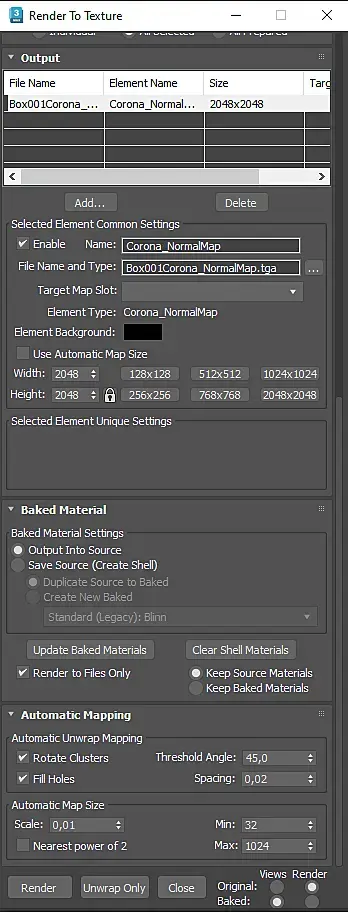 Действительно - текстуры он не смешивает. Но уменьшает их размер, а нормал мап рендерить вообще отказывается. Полагаю это из-за короновских материалов. Не знаю поможет ли конвертация сцены в виреевскую, но пробовать не хочу, т.к. цель сделать все на короне