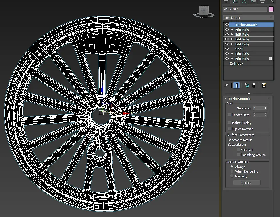 Мои модели обычно имеют такой вид. Где каждый логический этап новый модификатор, что бы можно было откатываться. Затем я коллапшу оставляя турмосмуз как отдельный и отправляю в основную сцену.